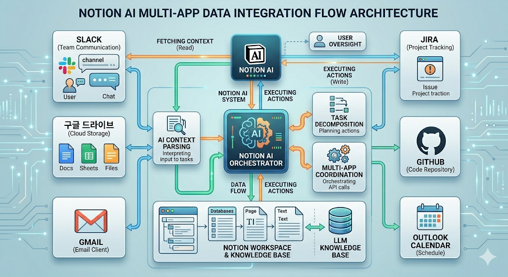2026년의 노션은 더 이상 고립된 섬이 아닙니다. '노션 커넥터(Notion Connectors)'를 통한 노션 AI 활용법은 슬랙(Slack), 구글 드라이브, 깃허브(GitHub) 등 외부 툴의 데이터까지 노션 안에서 통합적으로 다룰 수 있게 해줍니다.