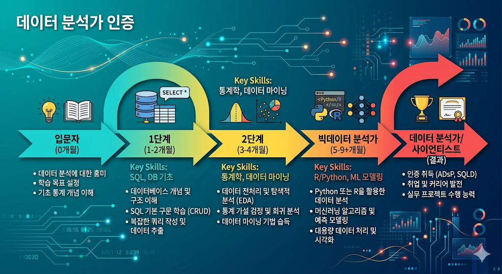 데이터 분석 자격증은 여러분이 "나는 데이터를 다룰 준비가 된 인재입니다"라는 최소한의 성실함과 기초 지식을 증명해 주는 수단입니다. 비전공자라고 해서 겁먹을 필요는 전혀 없습니다. 매년 수만 명의 비전공 합격생이 배출되고 있으며, 시중에 훌륭한 무료 강의와 커뮤니티가 활성화되어 있습니다.