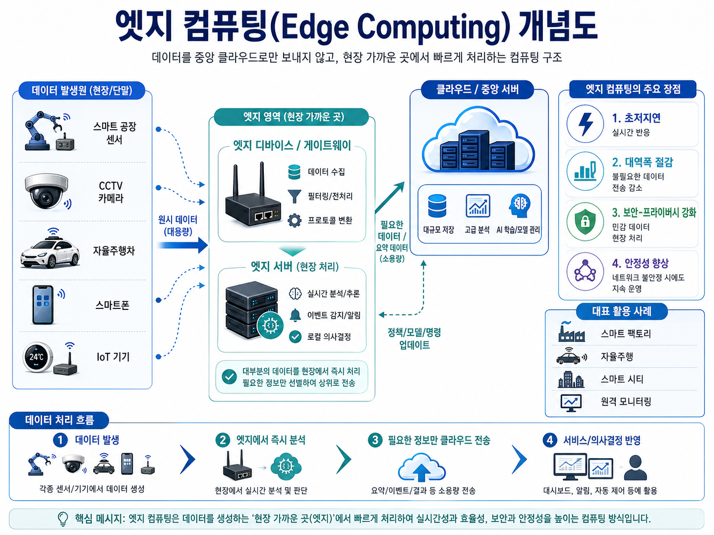 엣지 컴퓨팅이 클라우드를 완전히 대체하는 것은 아닙니다. 실시간 응답과 보안이 중요한 업무는 '엣지'가 맡고, 방대한 데이터의 장기 저장과 대규모 학습은 '클라우드'가 맡는 하이브리드 구조가 2026년의 표준입니다.